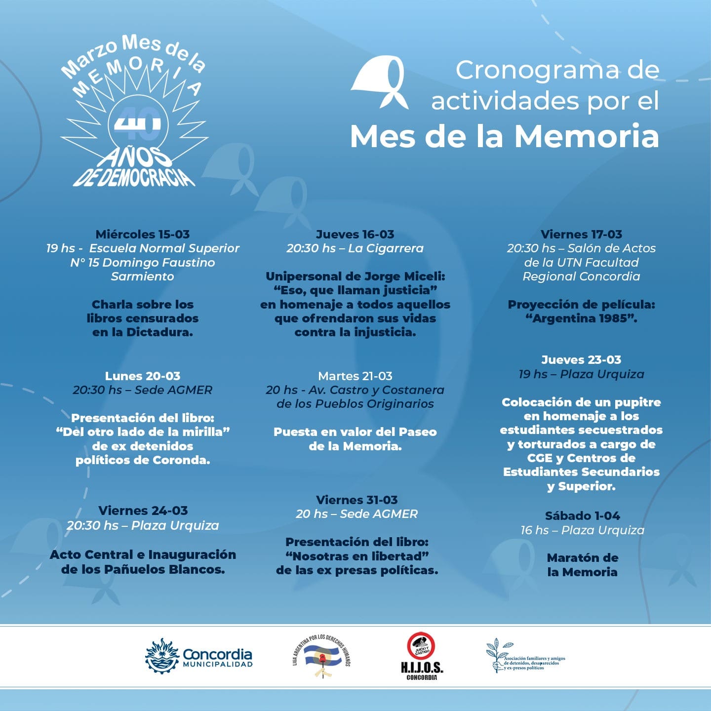 Desde la Comisión Municipal de Derechos Humanos de la Municipalidad de Concordia se dio a conocer el cronograma de actividades organizado por instituciones, organizaciones sociales y centros de estudiantes para conmemorar el Mes de la Memoria y en repudio al golpe de Estado del 24 de marzo de 1976.