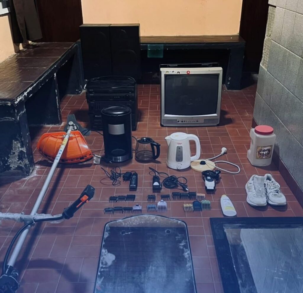 Entre los elementos denunciados como robados se encontraban una moto guadaña, una cafetera, una pava eléctrica, un equipo de música marca Philips, un espejo, un televisor, tres máquinas de cortar pelo, un secador de pelo y una buclera, entre otros.
