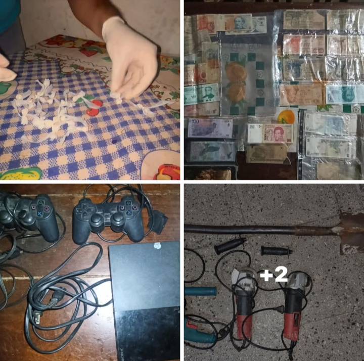 Además, durante los allanamientos se recuperaron varios elementos denunciados como robados, entre ellos dos amoladoras marca Black & Decker, un taladro color verde, una pala de punta, dos consolas PlayStation 2 completas y una colección de billetes antiguos de distintas denominaciones.